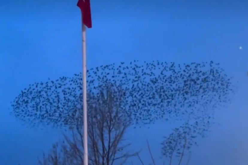 Kuşların Türk bayrağı çevresindeki mest eden dansı kamerada