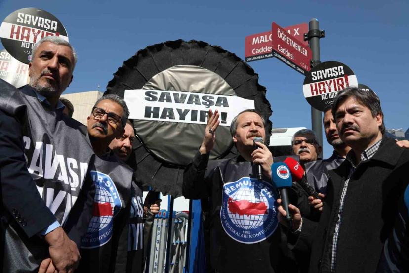 Yalçın, konuşmasının ardından konfederasyon üyeleriyle üzerinde ‘Savaşa hayır’ yazılı siyah çelengi, ABD’nin Ankara Büyükelçiliğinin önüne bıraktı.