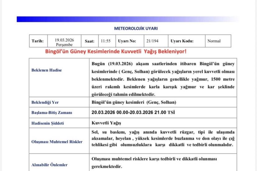 kesimlerinde ( Genç, Solhan) görülecek yağışların yerel kuvvetli olması beklenmektedir. Beklenen yağışların genellikle yağmur, 1500 metre üzeri rakımlı kesimlerde karla karışık yağmur ve kar şeklinde görüleceği tahmin edilmektedir. Sel, su baskını, yağış anında kuvvetli rüzgar, tipi ile ulaşımda aksamalar, heyelan , yüksek kesimlerde buzlanma ve don olayı ile çığ tehlikesi gibi olumsuzluklara karşı dikkatli ve tedbirli olunmalıdır" dedi.