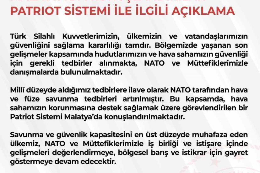 "Türk Silahlı Kuvvetlerimizin, ülkemizin ve vatandaşlarımızın güvenliğini sağlama kararlılığı tamdır. Bölgemizde yaşanan son gelişmeler kapsamında hudutlarımızın ve hava sahamızın güvenliği için gerekli tedbirler alınmakta, NATO ve müttefiklerimizle danışmalarda bulunulmaktadır. Milli düzeyde aldığımız tedbirlere ilave olarak NATO tarafından hava ve füze savunma tedbirleri artırılmıştır. Bu kapsamda, hava sahamızın korunmasına destek sağlamak üzere görevlendirilen bir Patriot sistemi Malatya’da konuşlandırılmaktadır. Savunma ve güvenlik kapasitesini en üst düzeyde muhafaza eden ülkemiz, NATO ve müttefiklerimizle iş birliği ve istişare içinde gelişmeleri değerlendirmeye, bölgesel barış ve istikrar için gayret göstermeye devam edecektir."