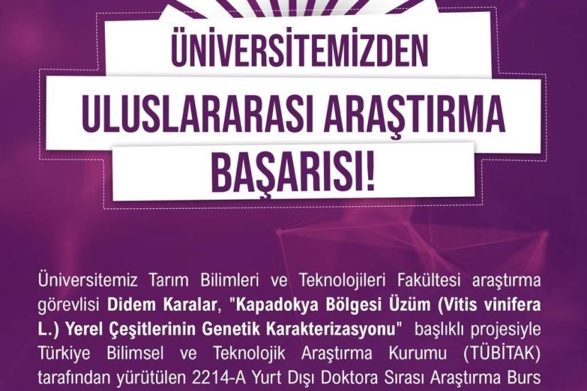 Niğde Ömer Halisdemir Üniversitesi Tarım Bilimleri ve Teknolojileri Fakültesi Araştırma Görevlisi Didem Karalar, "Kapadokya Bölgesi Üzüm (Vitis vinifera L.) Yerel Çeşitlerinin Genetik Karakterizasyonu" başlıklı projesiyle Türkiye Bilimsel ve Teknolojik Araştırma Kurumu (TÜBİTAK) tarafından yürütülen 2214-A Yurt Dışı Doktora Sırası Araştırma Burs Programı kapsamında destek almaya hak kazandı.