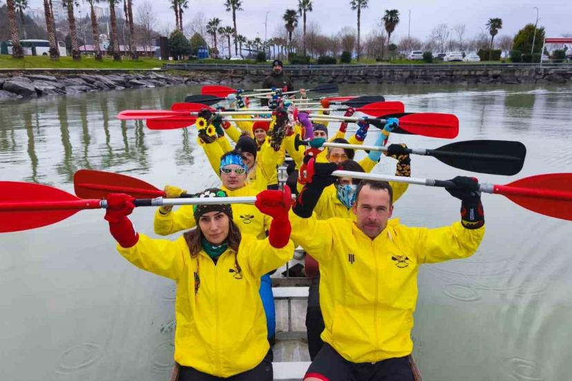 Samsun’da sporcular, Down Sendromu Haftası kapsamında toplumsal farkındalık oluşturmak amacıyla, antrenman sırasında renkli çorapları ellerine geçirerek kürek çektiler.