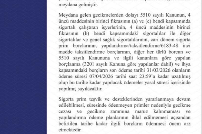 SGK tarafından yapılan açıklamada, "Kurum muhasebe işlemlerinin yürütüldüğü Mali Otomasyon Sistemi (MOSIP) altyapısında yapılan güncelleme çalışmalarından dolayı bazı hizmetlere erişilmesinde gecikmeler meydana gelmiştir. Meydana gelen gecikmelerden dolayı 5510 sayılı Kanunun, 4 üncü maddesinin birinci fıkrasının (a) ve (c) bendi kapsamında sigortalı çalıştıran işyerlerinin, 4 üncü maddesinin birinci fikrasının (b) bendi kapsamındaki sigortalılar ile diğer sigortalılar ve genel sağlık sigortalılarının, cari dönem sigorta prim borçlarının, yapılandırma/taksitlendirme/6183-48 inci madde taksitlendirme borçlarının, diğer her türlü borcun ve 5510 sayılı Kanununa ve ilgili kanunlara göre yapılan borçlanma (3201 sayılı Kanuna göre yapılanlar dahil) ve ihya kapsamındaki borçların son ödeme tarihi 31/03/2026 olanların ödeme süresi 7 Nisan 2026 tarihi saat 23:59’a kadar uzatılmış olup bu tarihe kadar yapılacak ödemeler yasal süresi içerisinde yapılmış sayılacaktır. Sigorta prim teşvik ve desteklerinden yararlanmaya devam edilebilmesi, süresinde ödenmeyen primler nedeniyle gecikme cezası ve gecikme zammına maruz kalınmaması ve yapılandırma ödeme planlarının ihlal edilmemesi açısından belirtilen tarihe kadar ilgili borçların ödenmesi önem arz etmektedir" denildi.
