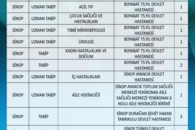 Sinop Atatürk Devlet Hastanesi: 1 kadın hastalıkları ve doğum uzmanı, 1 iç hastalıkları uzmanı. Boyabat 75. Yıl Devlet Hastanesi: Deri ve zührevi hastalıkları, acil tıp, çocuk sağlığı ve hastalıkları, tıbbi mikrobiyoloji, üroloji branşlarında birer uzman hekim; ayrıca 1 kadın hastalıkları ve doğum uzmanı (tabip kadrosu) ve 2 pratisyen tabip. Ayancık Devlet Hastanesi: 1 iç hastalıkları uzmanı.