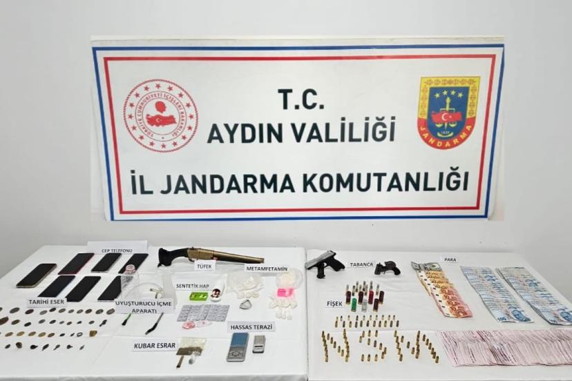 Aydın İl Jandarma Komutanlığı Narkotik Suçlarla Mücadele Şube Müdürlüğü ve Söke İlçe Jandarma Komutanlığı ekiplerince, 24 Mart 2026 günü Söke ilçesinde yürütülen çalışmalar kapsamında uyuşturucu ve tarihi eserlere yönelik operasyon düzenlendi. Operasyonda, şüphelilerin ikametlerinde yapılan aramalarda; 180 gram metamfetamin, 20 gram esrar, 60 adet sentetik ecza hapı, 2 adet hassas terazi, 3 adet bong aparatı, 2 adet tabanca, 1 adet kırma av tüfeği, 93 adet tabanca fişeği, 55 bin TL nakit para ile birlikte 10 adet tarihi para, 19 adet sikke, 13 adet tarihi obje, 1 adet tarihi yüzük ve Bizans dönemine ait 1 adet tarihi eser ele geçirildi. Ayrıca 6 adet cep telefonuna da el konuldu.