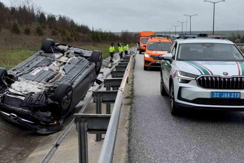 Edirne-Kırklareli otoyolunda yağışın etkisiyle kontrolden çıkarak takla atan otomobilde bulunan kişiler yara almadan kurtuldu.