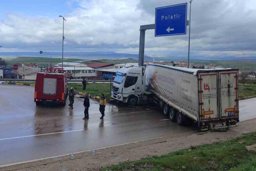 Olay, Ankara Ayaş yolu sanayi girişi mevkisinde meydana geldi. Edinilen bilgiye göre, yağışlı hava nedeniyle kayganlaşan yolda seyir halindeki tır, sürücüsünün direksiyon hakimiyetini kaybetmesi sonucu refüje çarparak durabildi.