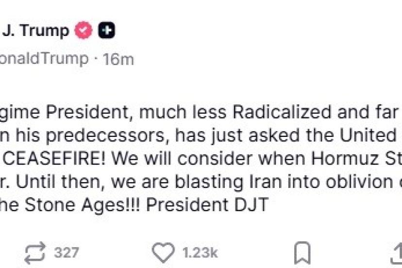 ABD Başkanı Donald Trump, Trurth Social platformundan İran’a ilişkin paylaşım yaptı. Trump paylaşımda, "İran’da yeni rejimin lideri, öncekilerden çok daha az radikalleşmiş ve çok daha zeki bir kişi olarak, ABD’den ateşkes talep etti. Hürmüz Boğazı ne zaman açık, serbest ve güvenli hale gelirse bunu o zaman değerlendireceğiz. O zamana kadar İran’ı yerle bir edeceğiz ya da deyim yerindeyse taş devrine döndüreceğiz" ifadelerini kullandı.