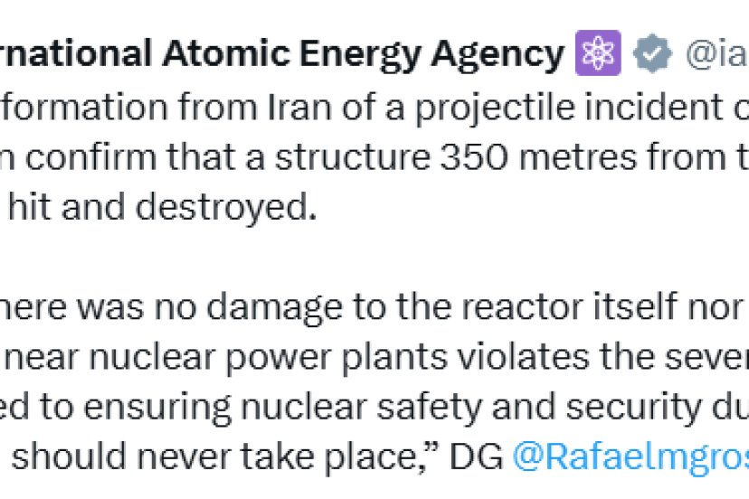 Uluslararası Atom Enerjisi Ajansı (UAEA), İran’daki Buşehr Nükleer Santrali reaktörüne 350 metre uzaklıktaki bir yapının vurularak imha edildiğini doğruladı. UAEA Başkanı Rafael Grossi, muhtemel güvenlik risklerine dikkat çekerek, "Nükleer santrallere veya yakınlarına yapılacak herhangi bir saldırı, silahlı bir çatışma sırasında nükleer güvenlik ve emniyetin sağlanmasıyla ilgili yedi temel ilkeyi ihlal eder ve asla gerçekleşmemelidir" uyarısında bulundu.