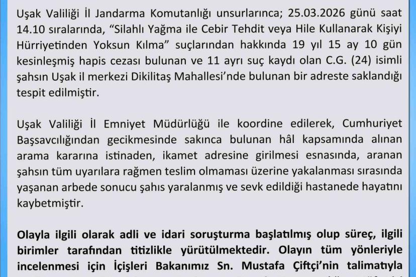 Uşak Valiliği’nden sosyal medya üzerinden yapılan açıklamada, "silahlı yağma" ile "cebir, tehdit veya hile kullanarak kişiyi hürriyetinden yoksun kılma" suçlarından aranan C.G. (24)’nin Dikilitaş Mahallesi’nde saklandığının tespit edildiği belirtildi. İl Jandarma Komutanlığı ekiplerinin, Uşak İl Emniyet Müdürlüğü ile koordineli olarak adrese düzenlediği operasyonda, şahsın güvenlik güçlerine teslim olmaması üzerine arbede yaşandığı, arbede sırasında yaralanan şahsın hastaneye kaldırıldığı ancak tüm müdahalelere rağmen kurtarılamadığı ifade edildi. Olayın ardından adli ve idari soruşturma başlatıldığı, sürecin tüm yönleriyle titizlikle sürdürüldüğü bildirildi.