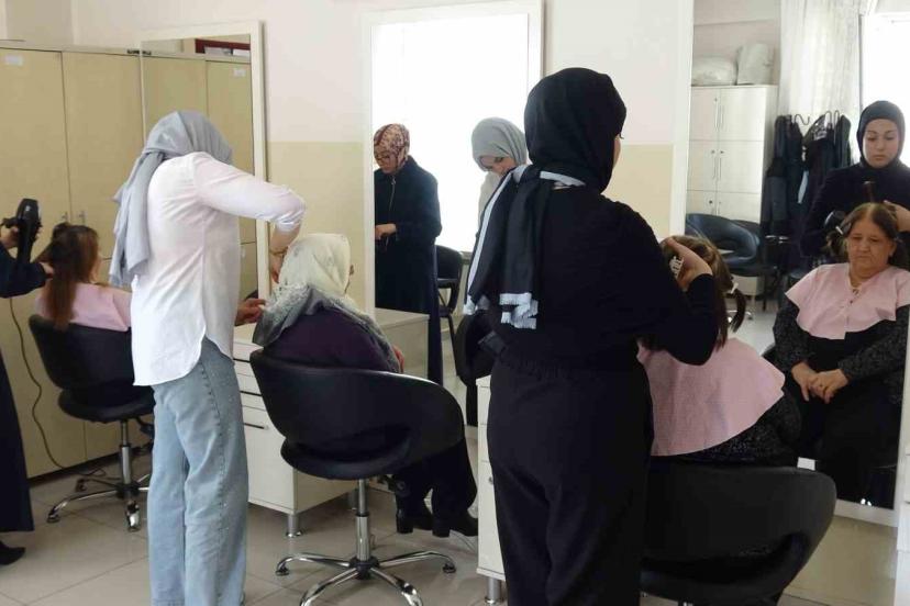 Tesisin bulunduğu Binevler Mahallesi’nde ikamet eden yaşlı kadınlar için düzenlenen anlamlı program kapsamında kuaförlük ve güzellik merkezi bölümü kursiyerleri, 40 yaşlı kadının saç kesimini ve cilt bakımını yaptı. Tesiste kuaförlük mesleğinin inceliklerini öğrenen kursiyerler, yaşlı kadınların saç kesimi başta olmak üzere manikür, pedikür ve kişisel bakımlarını ücretsiz yaparak yaşlıları oldukça sevindirdi ve mutlu etti.