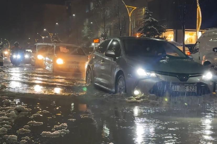 Hakkari’nin Yüksekova ilçesinde yoğun sağanak ve karla karışık yağmur nedeniyle caddeler göle dönerken, otomobiller ise adeta suda yüzdü.