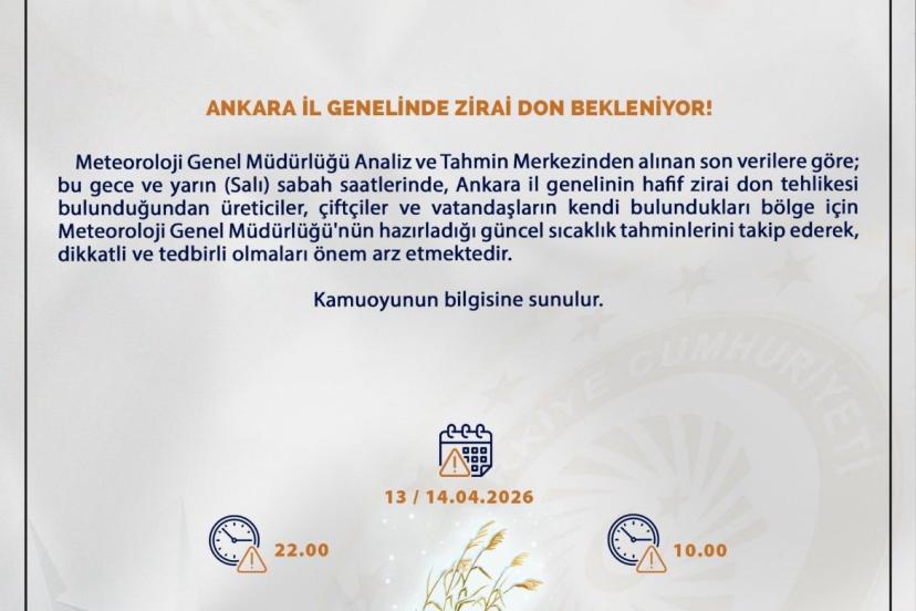 Açıklama, "Meteoroloji Genel Müdürlüğü Analiz ve Tahmin Merkezinden alınan son verilere göre; bu gece ve yarın (Salı) sabah saatlerinde, Ankara il genelinin hafif zirai don tehlikesi bulunduğundan üreticiler, çiftçiler ve vatandaşların kendi bulundukları bölge için Meteoroloji Genel Müdürlüğü’nün hazırladığı güncel sıcaklık tahminlerini takip ederek, dikkatli ve tedbirli olmaları önem arz etmektedir" ifadelerine verildi.