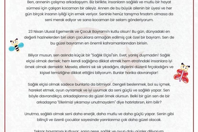 Sağlık Bakanlığının merkez teşkilatında çalışanların 6-12 yaş arasındaki 2 bin 36 sağlık elçisi çocuğuna mektup gönderen Bakan Memişoğlu, mektubunda bugünün çocuklara armağan edilmiş çok özel bir bayram olduğunu belirterek, "Sen de bu güzel bayramın en önemli kahramanlarından birisin. Sana neşe, sağlık ve bol bol oyun dolu günler diliyorum" ifadelerine yer verdi.