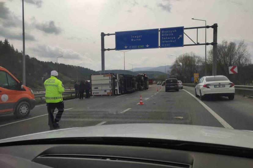 Kaza, Bilecik Bozüyük çevre yolunda meydana geldi. Edinilen bilgilere göre, Bursa İnegöl istikametinde, halinde bulunan tır, sürücüsünün bir anlık direksiyon hakimiyetini kaybetmesi sonucu kontrolden çıkarak devrildi. İhbar üzerine olay yerine polis ekipleri sevk edilirken, bölgede güvenlik önlemleri alındı. Devrilen tır, olay yerine çağrılan üç vinç yardımıyla bulunduğu yerden kaldırıldı. Öte yandan, kaza nedeniyle bölgede trafik bir süre aksarken, çalışmaların tamamlanmasının ardından ulaşım normale döndü.