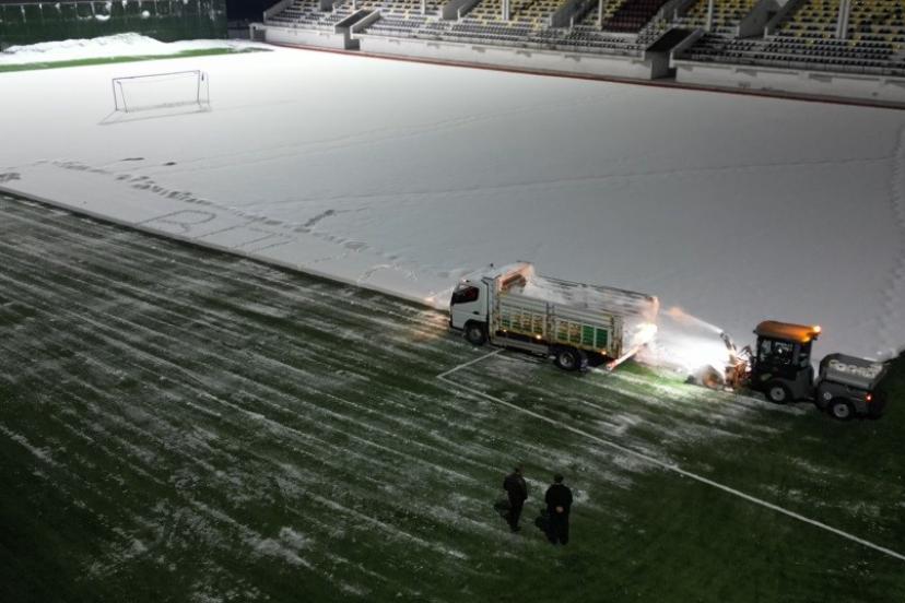 Bitlis’te futbol karşılaşmalarının aksamaması için ekipler statta kar temizleme çalışması başlattı.