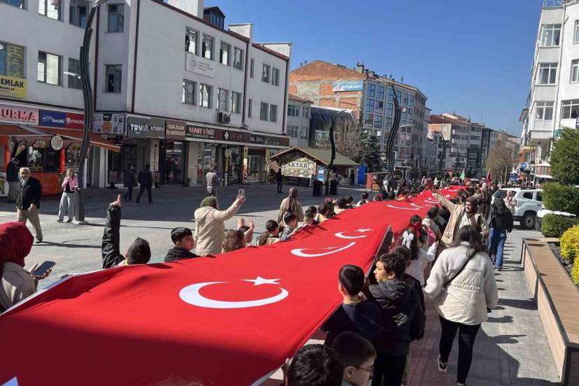 Bolu’da öğrenciler 200 metrelik Türk bayrağıyla caddede yürüdü