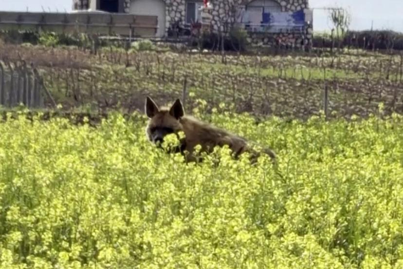 Adıyaman’ın Besni ilçesinde çizgili sırtlan sarı çiçeklerle kaplı tarlada yürürken görüntülendi.
