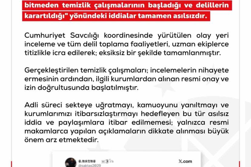 "Olay yeri incelemesi bitmeden temizlik çalışmalarının başladığı ve delillerin karartıldığı’ iddiaları asılsızdır"