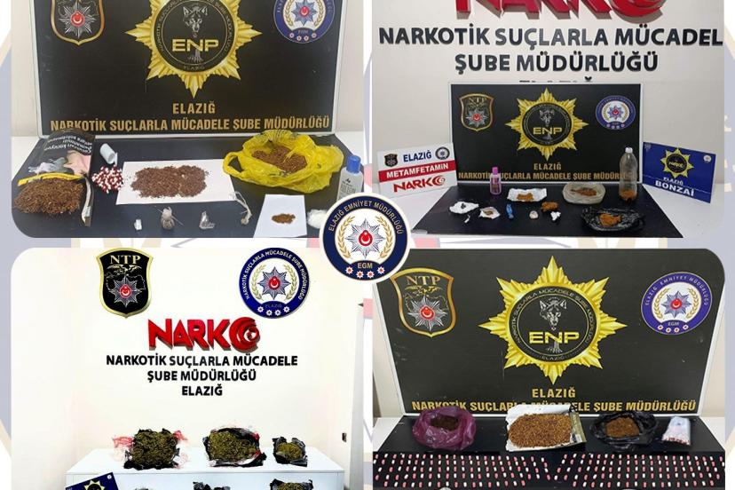 Elazığ Cumhuriyet Başsavcılığı koordinesinde İl Emniyet Müdürlüğü Narkotik Suçlarla Mücadele ve Asayiş Şube Müdürlüğü tarafından uyuşturucu ile mücadele kapsamında son bir ay içerisinde, uyuşturucu madde kullanan ve uyuşturucu madde ticareti yapan şahıslara yönelik operasyonlar düzenlendi. Operasyonlarda 5 kilo 500 gram skunk maddesi, 2 kilo 324 gram sentetik kannobinoid maddesi, 909 gram kokain maddesi, 872 gram metamfetamin maddesi, 8 bin 752 adet sentetik ecza maddesi ve 4 adet hassas terazi ele geçirildi.