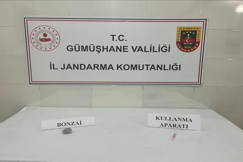 Şiran İlçe Jandarma Komutanlığı ekiplerince şüpheli şahsın bulunduğu araç, Şiran ilçesi Güreş köyü mevkiinde durduruldu. Uyuşturucu arama köpeğinin araca tepki vermesi üzerine yapılan kontrolde, şüpheli şahıs tarafından 15 gram sentetik kannabinoid (bonzai) ve 1 adet kullanma aparatı ele geçirildi.