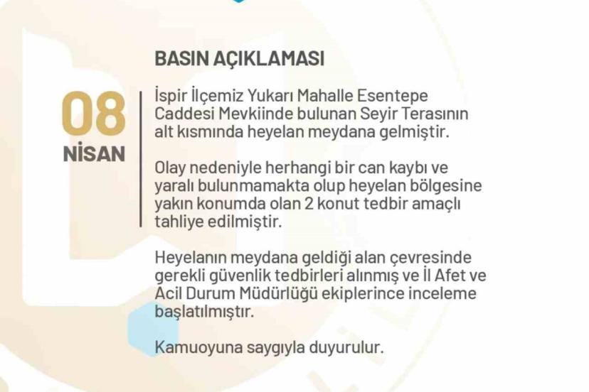 Erzurum Valiliği’nden alınan bilgilere göre olay, İspir ilçesi Yukarı Mahalle Esentepe Caddesi mevkiinde bulunan seyir terasının alt kısmında meydana geldi. Heyelan sonrası bölgeye ekipler sevk edildi. Yaşanan doğa olayında herhangi bir can kaybı veya yaralanmanın bulunmadığı belirtilen açıklamada, heyelan bölgesine yakın konumda bulunan 2 konutun güvenlik gerekçesiyle tahliye edildiği kaydedildi.