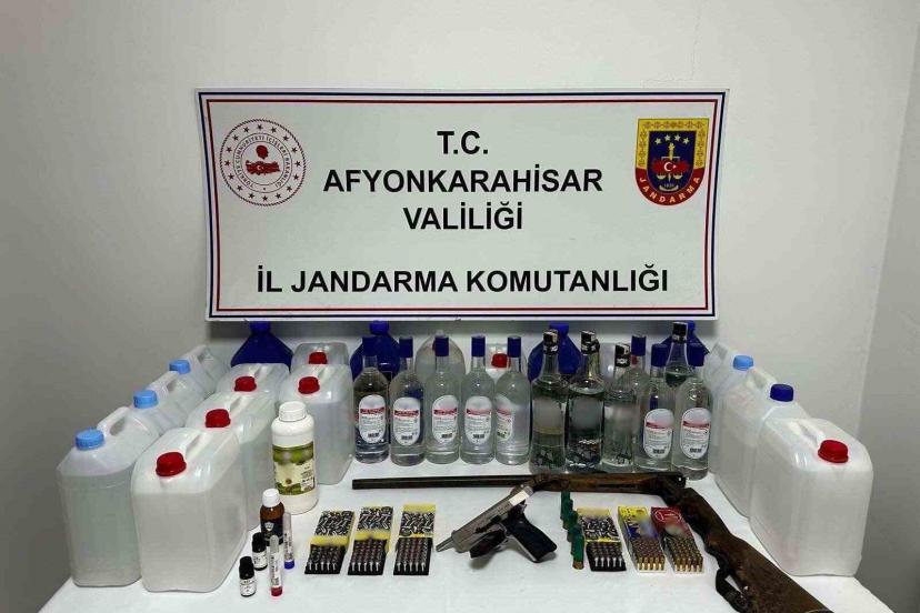 Afyonkarahisar’da jandarma tarafından bir köy evine yapılan baskında sahte alkol yapımında kullanılan malzemelerle birlikte ruhsatsız silahlar ele geçirilirken, olayla ilgili 2 kişi gözaltına alındı.