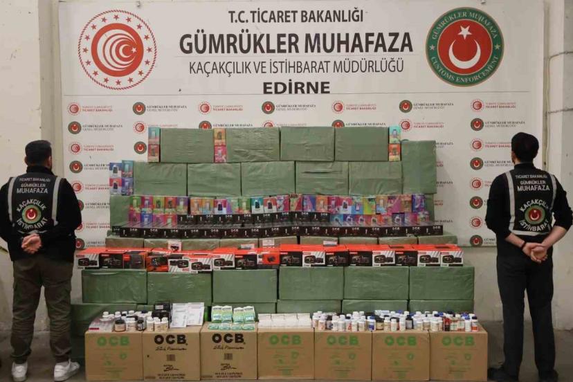 Gümrükler Muhafaza ekiplerince 19 Nisan’da Kapıkule Gümrük Sahası’na gelen tır ve çekici risk kriterleri çerçevesinde kontrole tabi tutuldu. Yapılan detaylı aramada faturasız, belgesiz, gümrüğe beyan edilmeyen ve ticari miktar ve mahiyet arz eden 10 bin 400 adet elektronik sigara, 720 bin adet sigara filtresi, 84 adet oto parça, 215 kutu vitamin ve kişisel bakım ürünü, 2 bin 520 adet ilaç cinsi eşya olmak üzere çok sayıda kaçak eşya ele geçirildi.