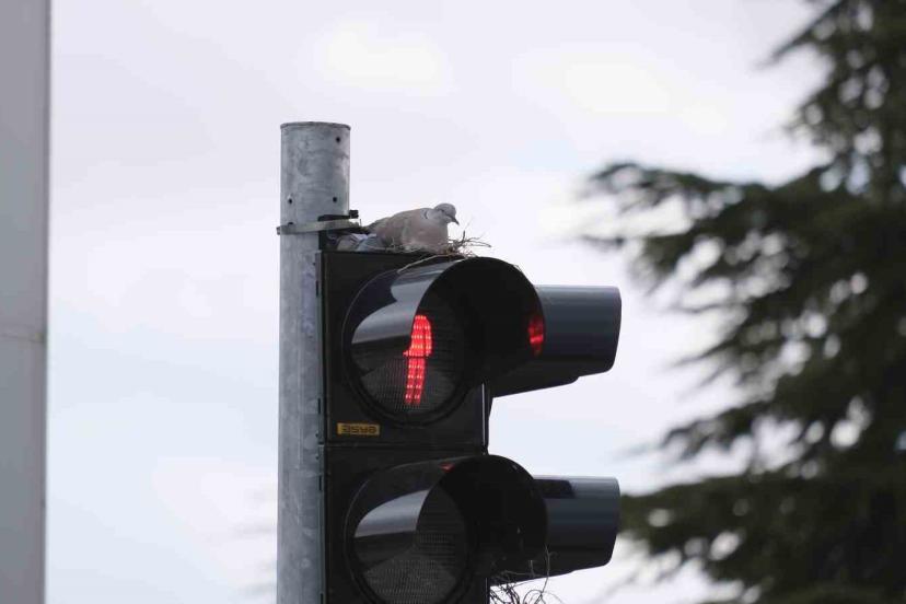 Karaman’ın en işlek kavşağındaki trafik lambasına yuva yapan kumru görenleri şaşırtıyor