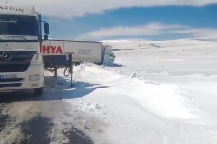 Kars’ta sürücüsünün direksiyon hakimiyetini kaybettiği tır, kayarak yolu kapattı.