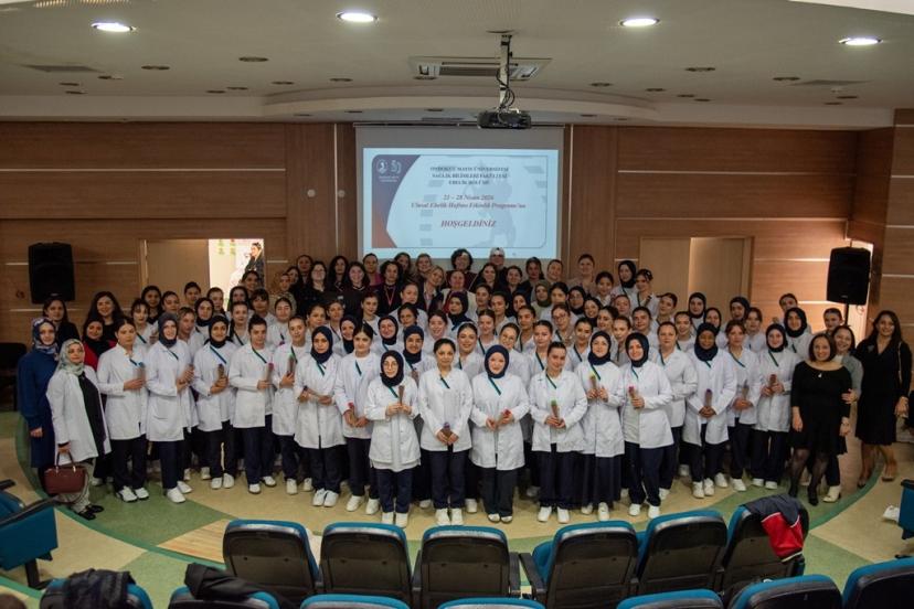 Etkinlik kapsamında gerçekleştirilen mezun–öğrenci buluşmasında, OMÜ Samsun Sağlık Yüksekokulu Ebelik Bölümü 2007 yılı mezunu Uzman Ebe Rukiye Tunç Aydın, "Ebelikte Mesleki Deneyimler" başlıklı sunumuyla öğrencilerle bir araya geldi. Aydın, saha deneyimlerini ve mesleki birikimini paylaşarak, genç ebe adaylarına yol gösterici bilgiler verdi. Program çerçevesinde düzenlenen törende 66 ebelik öğrencisi fetoskoplarını teslim alarak, meslek yaşamlarına ilk sembolik adımlarını attı. Duygu dolu anların yaşandığı törende öğrenciler sahneye davet edilerek fetoskopları takdim edildi. Etkinliğin devamında Dr. Öğr. Üyesi Nuran Mumcu tarafından 4. sınıf öğrencilerine yönelik "Doğum Bakım Rehberi ve Partograf Atölyesi" düzenlenirken, dönem boyunca hazırlanan ders materyalleri de sergilendi.