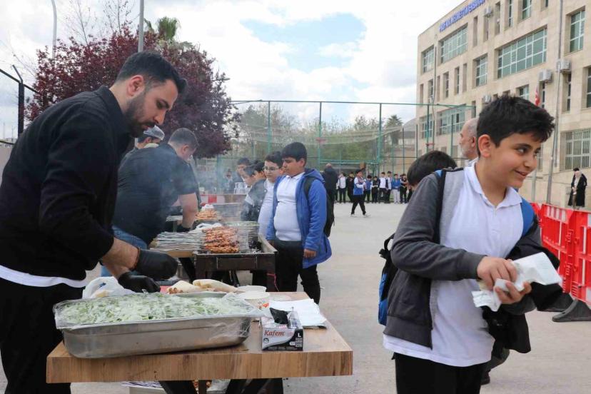 Şanlıurfa’da Prof. Dr. Necmettin Erbakan İmam Hatip Ortaokulu’nda öğrencilere kebap ikramı yapıldı. Okul bahçesinde kurulan mangallarda, kömür ateşinde pişirilen tavuk incik kebabı, sıraya giren öğrencilere dürüm halinde dağıtıldı. Öğrenciler, kendilerine ikram edilen kebabı okul bahçesinde yedi.