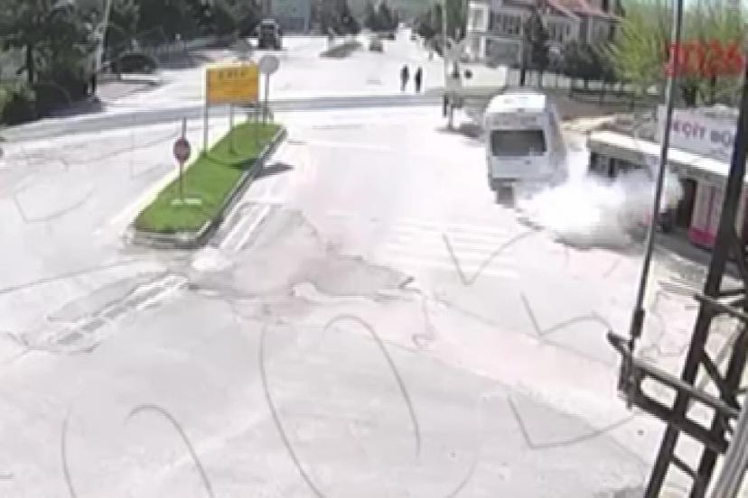 Amasya’da hemzemin geçit yakınında servis minibüsü kontrolden çıkıp bir büfenin önündeki kaldırıma çarparak önüne kattığı durağı yere serdi. Kazadan saniyeler önce iki genç kızın hemzemin geçitten karşıya geçtiği görüldü. O anlar çevredeki güvenlik kamerasına yansıdı.