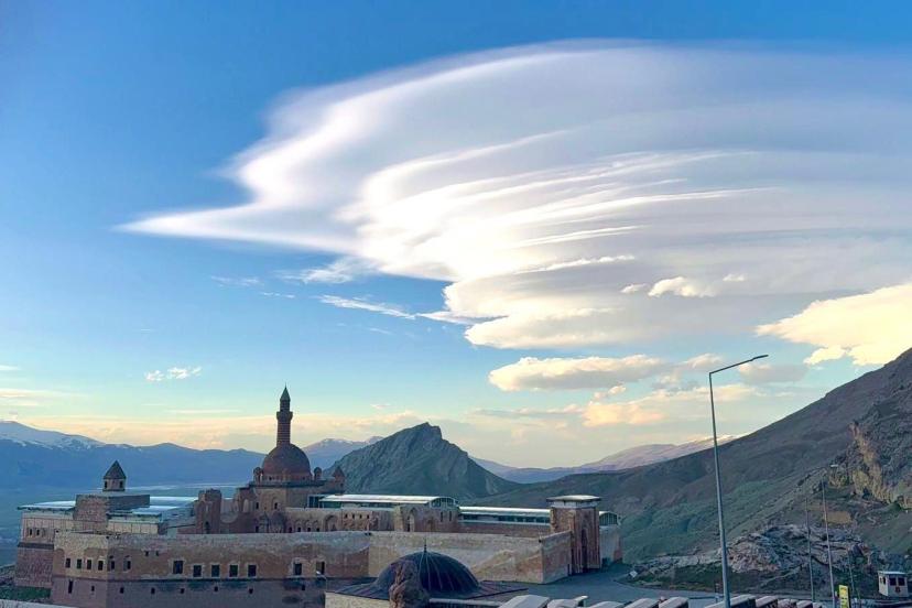 Ağrı’nın Doğubayazıt ilçesinde İshak Paşa Sarayı üzerinde oluşan mercek bulutları, gökyüzünde görsel şölen sundu.