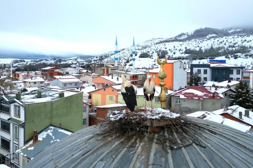 İlçe merkezinde bulunan bir caminin kubbesine yuva kuran leylek ailesi, kar yağışıyla birlikte yağlı tabloları andıran manzaralar oluşturdu. Dron ile havadan kaydedilen görüntülerde, yuva üzerindeki leyleklerin karla kaplı çatılar ve beyaza bürünen ilçe manzarasıyla birlikte dikkat çektiği görüldü. 25 yıl sonra ilçeye gelen leyleklerin soğuk hava ve kar yağışına rağmen yuvalarını terk etmemesi dikkat çekerken, bu durum ilçe halkı tarafından da ilgiyle karşılandı. Öte yandan, yüksek kesimlerde etkisini sürdüren kar yağışının ardından ortaya çıkan bu görüntüler, bahar ile kışın aynı karede buluştuğu nadir anlardan biri olarak yorumlandı.
