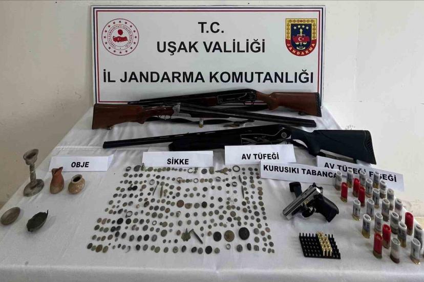 Uşak’ta jandarma ekiplerince düzenlenen operasyonda çok sayıda sikke ve tarihi obje ele geçirildi.