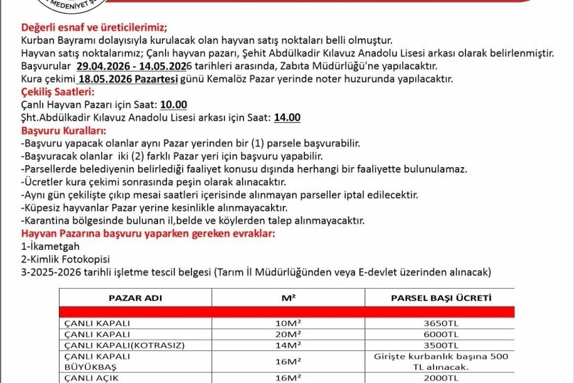 Hayvan pazarına başvuru yapmak isteyenlerin ikametgah ve kimlik fotokopisinin yanı sıra, Tarım İl Müdürlüğü’nden ya da E-devlet üzerinden alınacak 2025-2026 tarihli işletme tescil belgesini hazırlamaları gerekiyor. Tüm bu belgelerin eksiksiz olarak Zabıta Müdürlüğü’ne teslim edilmesi önem taşıyor.