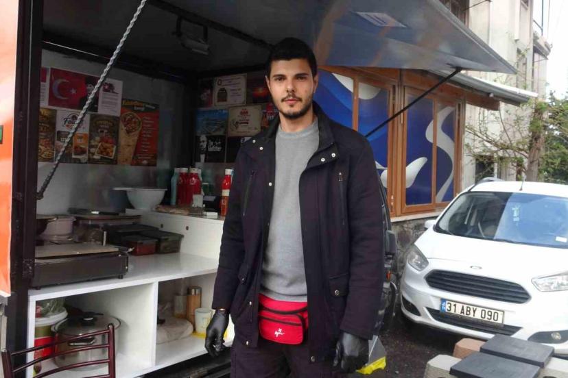 Hatay’da depremde iş yerini ve yuvasını kaybeden Erhan Çapanoğlu, yıllarca videolarda izlediği sokakta yiyecek satanlara özen...