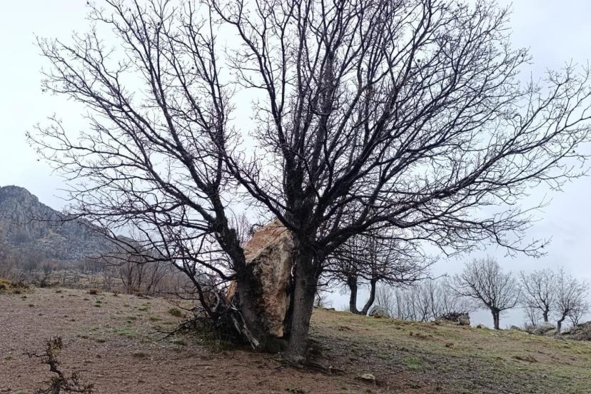 Adıyaman’da yamaçtan koparak yuvarlanan büyük bir kaya parçası, bir ağaca takılarak durdu.