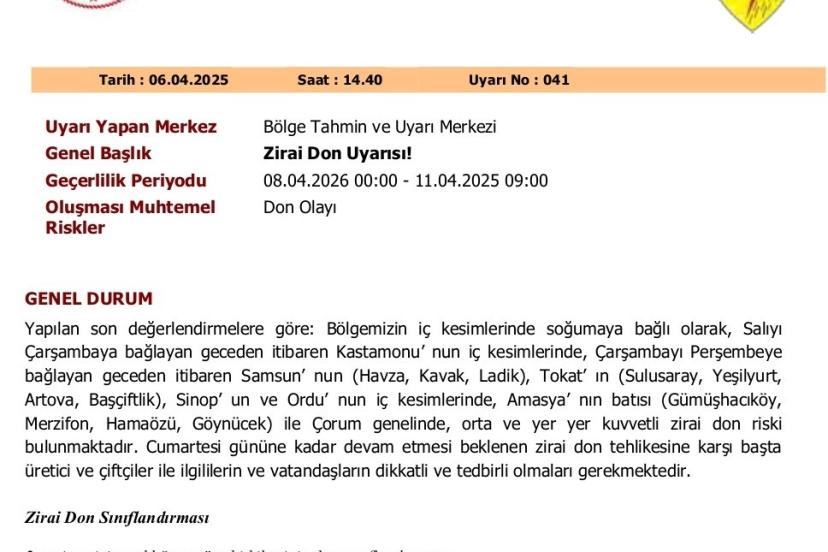 MGM Bölge Tahmin ve Uyarı Merkezi tarafından yayımlanan uyarıda, 8 Nisan gece saatlerinden itibaren başlayıp 11 Nisan sabahına kadar sürmesi beklenen don olayının, özellikle iç kesimlerde etkili olacağı bildirildi. Açıklamada, Kastamonu, Tokat, Sinop, Ordu, Amasya ve Çorum ile birlikte Samsun’un iç ilçelerinde orta ve yer yer ’kuvvetli zirai don’ beklendiği ifade edildi.